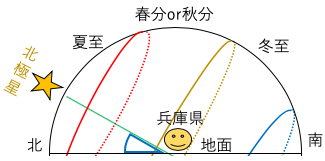 春分、秋分の南中高度:90度-緯度夏至[北半球]:90度-緯度+23.4度