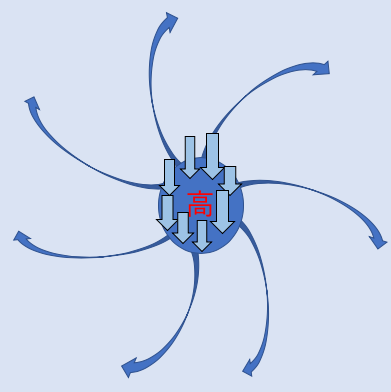高気圧:空気が重い(濃い)。押し出す力が強い。下降気流が起こる→上空の雲(水)が消えて晴れやすい。
