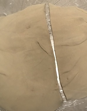 7.大型のまな板がない場合はサランラップを机にひきつめて麺棒で生地を伸ばす。